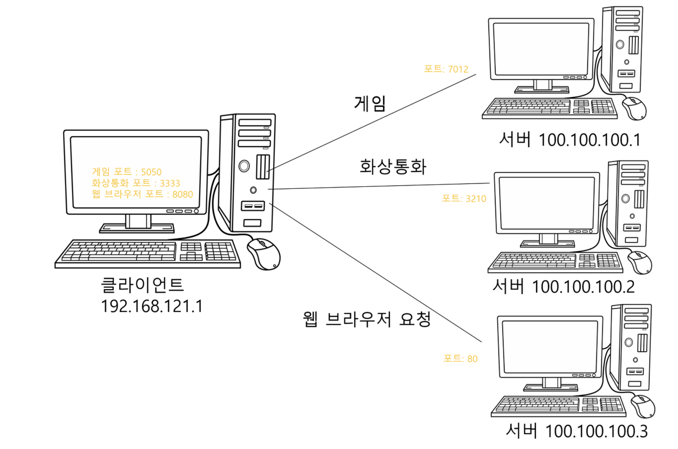 ํ ๋์ ํด๋ผ์ด์ธํธ PC์์ ์ฌ๋ฌ ๊ฐ์ IP๋ฅผ ์ฐ๊ฒฐํ๋ ค๋ฉด ์ด๋กํด์ผ ํ ๊น? IP๋ ํด๋น ๊ธฐ๊ธฐ์ ๊ณ ์ ํ ์ฃผ์๊ฐ์ด๋ฏ๋ก IP๋ง์ผ๋ก๋ ๊ตฌ๋ถํ๊ธฐ ์ด๋ ต๋ค. ๋ฐ๋ผ์, ๊ฐ์ IP์์ ๋ชฉ์ (ํ๋ก์ธ์ค)์ ๋ฐ๋ผ ๋ถ๋ฅํ๊ธฐ ์ํด์๋ ํฌํธ๋ผ๋ ๊ฒ์ ์ฌ์ฉํ๋ค.