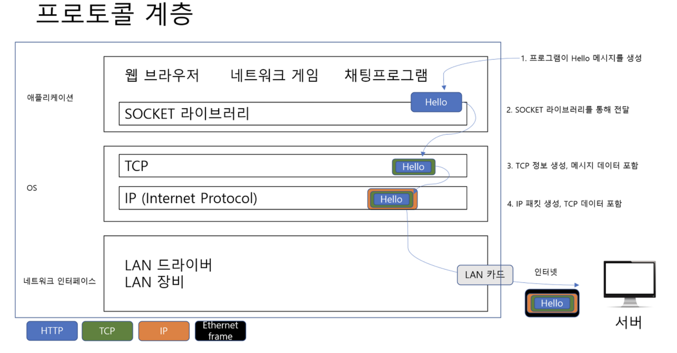 ๋ฐ์ดํฐ๋ฅผ ์ ์กํ๋ ค๊ณ ํ ๋ ๊ฐ ํ๋กํ ์ฝ ๊ณ์ธต์์ ๋ฐ์ดํฐ ํจํท์ ์๋ ๊ทธ๋ฆผ๊ณผ ๊ฐ์ ๋ฐฉ์์ผ๋ก ๊ฐ๊ณตํ๋ค.
