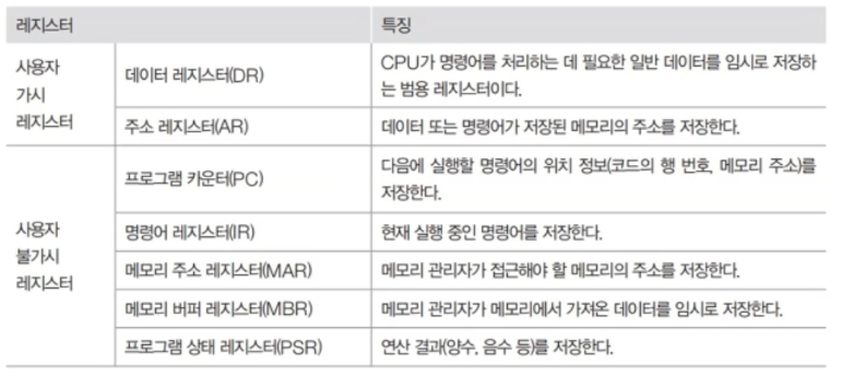 - ๋ ์ง์คํฐ(Register): ์์ ์ ํ์ํ ๋ฐ์ดํฐ๋ฅผ CPU ๋ด๋ถ์ ๋ณด๊ดํ๋ ๊ณณ