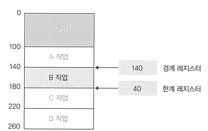 ๋ฉ๋ชจ๋ฆฌ๋ฅผ ๋ณดํธํ๊ธฐ ์ํด CPU๋ ํ์ฌ ์งํ ์ค์ธ ์์ ์ ๋ฉ๋ชจ๋ฆฌ ์์ ์ฃผ์๋ฅผ ๊ฒฝ๊ณ ๋ ์ง์คํฐ์ ์ ์ฅํ ํ ์์ ํ๋ค. ๊ทธ๋ฆฌ๊ณ ํ์ฌ ์งํ ์ค์ธ ์์ ์ด ์ฐจ์งํ๊ณ ์๋ ๋ฉ๋ชจ๋ฆฌ์ ํฌ๊ธฐ, ์ฆ ๋ง์ง๋ง ์ฃผ์๊น์ง์ ์ฐจ์ด๋ฅผ ํ๊ณ ๋ ์ง์คํฐ์ ์ ์ฅํ๋ค. ๋ฐ๋ผ์, ์์ ์ด ์งํ๋๋ ๋์ ์ด ๋ ๋ ์ง์คํฐ์ ์ฃผ์ ๋ฒ์๋ฅผ ๋ฒ์ด๋๋์ง ํ๋์จ์ด ์ธก๋ฉด์์ ์ ๊ฒํจ์ผ๋ก์จ ๋ฉ๋ชจ๋ฆฌ๋ฅผ ๋ณดํธํ๋ค.