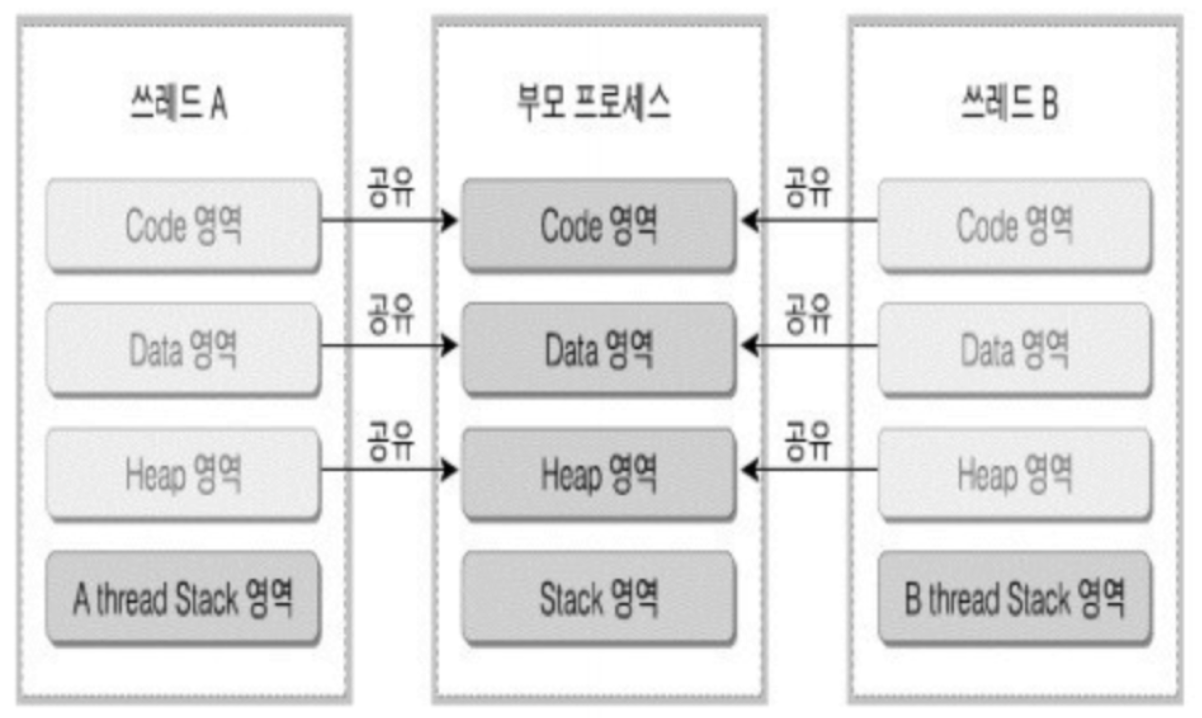 ์ ํํ๊ฒ ๋งํ๋ฉด ์ค๋ ๋๋ค๋ผ๋ฆฌ๋ ํ๋ก์ธ์ค์ ์ฝ๋, ๋ฐ์ดํฐ, ํ ์์ญ์ ๊ณต์ ํ๋ค. ์ค๋ ๋๊ฐ ๋ง๋ค์ด์ง๋ฉด ํ๋ก์ธ์ค์ ์คํ ์์ญ, ๋ ์ ํํ๊ฒ ๋งํ์๋ฉด ์คํ ์์ญ๊ณผ ํ ์์ญ ์ฌ์ด์ ์ค๋ ๋์ ์คํ ์์ญ์ ๋ง๋ค์ด๋๋ค.