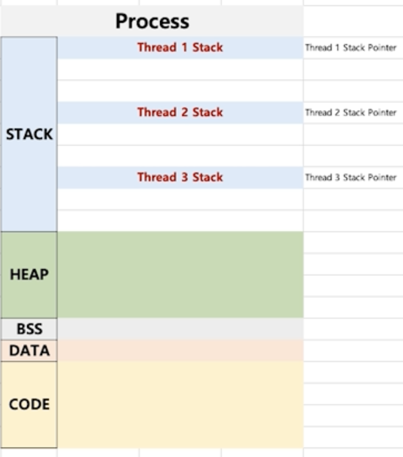 ์ค๋ ๋๋ฅผ ๋ง๋ ํ๋ก์ธ์ค๋ ๊ฐ ์ค๋ ๋๋ค์ ์คํ ์์ญ์ ๊ฐ๋ฅดํค๋ ์คํ ํฌ์ธํฐ์ ์ค๋ ๋๋ค์ ์คํ๋ ๋ช ๋ น์ด์ ์ฃผ์๋ฅผ ๊ฐ์ง๊ณ ์๋ PC(ํ๋ก๊ทธ๋จ ์นด์ดํฐ)๋ฅผ ์คํ ์์ญ๊ณผ ํ ์์ญ ์ฌ์ด์ ๊ณต๊ฐ์ ์ ์ฅํ๋ค.