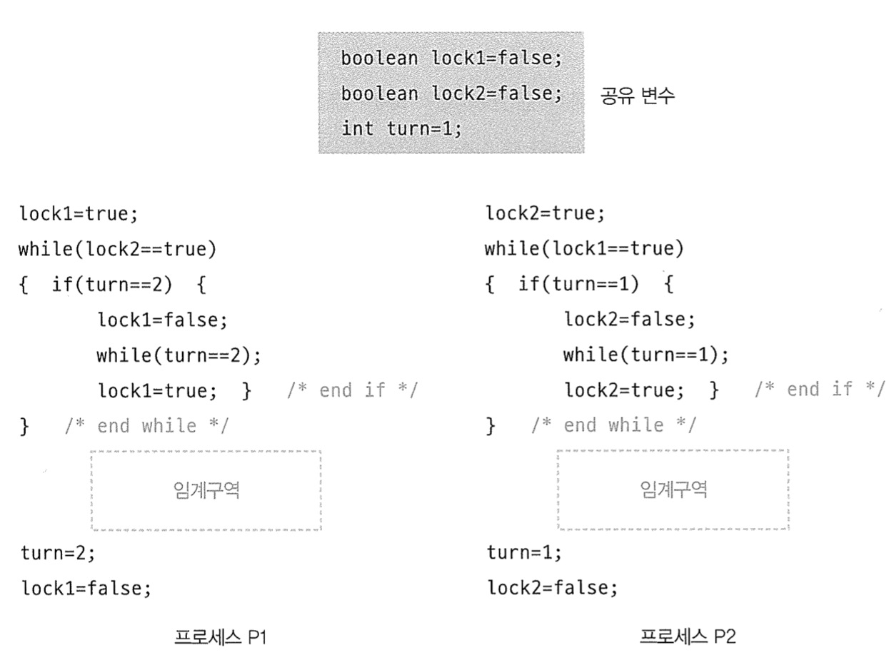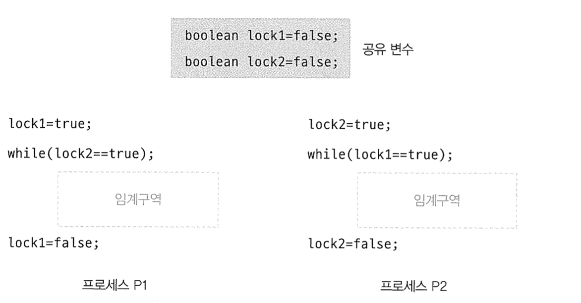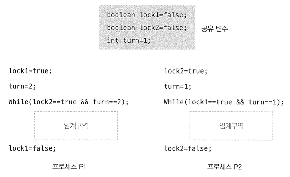 ๋ฅผ ์คํํ๊ณ ๋ฌธ๋งฅ ๊ตํ์ด ์ผ์ด๋์ P1์ผ๋ก ๋์ด๊ฐ๋ค๊ณ ๊ฐ์ ํ๋ฉด P1, P2 ๋ ํ๋ก์ธ์ค ๋ชจ๋ ๊ฐ์์ while ์กฐ๊ฑด๋ฌธ์ ๊ฑธ๋ ค ๋ฌดํ ๋ฃจํ์ ๋น ์ ธ์ ์๊ณ ๊ตฌ์ญ์ ์ง์