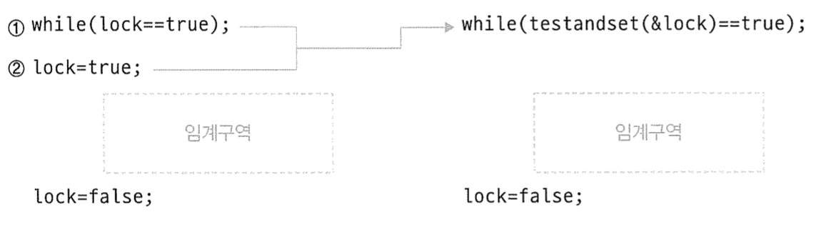 ์ํธ ๋ฐฐ์ ์กฐ๊ฑด์ด๋ ํ์ ๋๊ธฐ ์กฐ๊ฑด์ ์ถฉ์กฑํ์ง ๋ชปํ๋ ์ฝ๋๋ค์ while(lock==true)๊ณผ lock=true๊ฐ ๋ถ๋ฆฌ๋์ด์ ๋ฌธ๋งฅ ๊ตํ์ด ์ผ์ด๋ฌ์ ๋ ๋ฌธ์ ๊ฐ ๋ฐ์ํด์ ๊ฐ ์กฐ๊ฑด๋ค์ ์ถฉ์กฑํ์ง ๋ชปํ๋ค. ์ด๋ฌํ ๊ฒฝ์ฐ, ํ๋์จ์ด์ ๋์์ ๋ฐ์ ๋ ์ฝ๋๋ฅผ ๋์์ ์คํํ ์ ์๊ฒ ํด ์ค ์ ์๋ค. ์์ ๊ทธ๋ฆผ์ฒ๋ผ ๊ฒ์ฌ์ ์ง์ ์ฝ๋๋ฅผ ์ด์ฉํ๋ฉด ๋ช ๋ น์ด ์คํ ์ค๊ฐ์ ํ์์์์ด ๊ฑธ๋ ค ์๊ณ ๊ตฌ์ญ์ ๋ณดํธํ์ง ๋ชปํ๋ ๋ฌธ์ ๊ฐ ๋ฐ์ํ์ง ์๋๋ค.