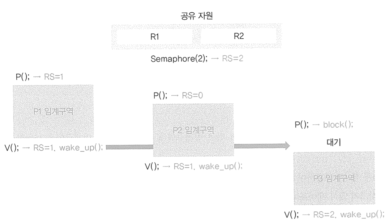 ์ด๊ธฐํ๋ฅผ ํ ๋ ์ ์ญ ๋ณ์ RS๋ฅผ n์ผ๋ก ์ด๊ธฐํํ๋ค. P()๋ ์ ๊ธ์ ์ํํ๋ ์ฝ๋๋ก, RS๊ฐ 0๋ณด๋ค ํฌ๋ฉด 1๋งํผ ๊ฐ์์ํค๊ณ ์๊ณ ๊ตฌ์ญ์ ์ง์ ํ๋ค. ๋ง์ฝ RS๊ฐ 0๋ณด๋ค ์์ผ๋ฉด 0๋ณด๋ค ์ปค์ง ๋๊น์ง ๊ธฐ๋ค๋ฆฐ๋ค. block()์ wake_up()์ด ์ ํธ๋ฅผ ๋ณด๋ผ ๋๊น์ง ๊ธฐ๋ค๋ฆฌ๋ ํจ์์ด๋ค. V()๋ ์ ๊ธ ํด์ ์ ๋๊ธฐํ๋ฅผ ๊ฐ์ด ์ํํ๋ ์ฝ๋๋ก RS ๊ฐ์ 1 ์ฆ๊ฐ์ํค๊ณ ๊ธฐ๋ค๋ฆฌ๊ณ ์๋ ๋ค๋ฅธ ํ๋ก์ธ์ค/์ค๋ ๋์๊ฒ ์๊ณ ๊ตฌ์ญ์ ์ง์ ํด๋ ์ข๋ค๋ wake_up() ์ ํธ๋ฅผ ๋ณด๋ธ๋ค.