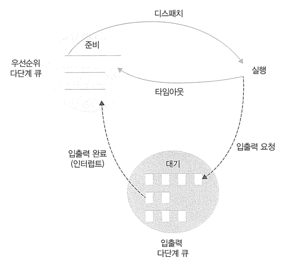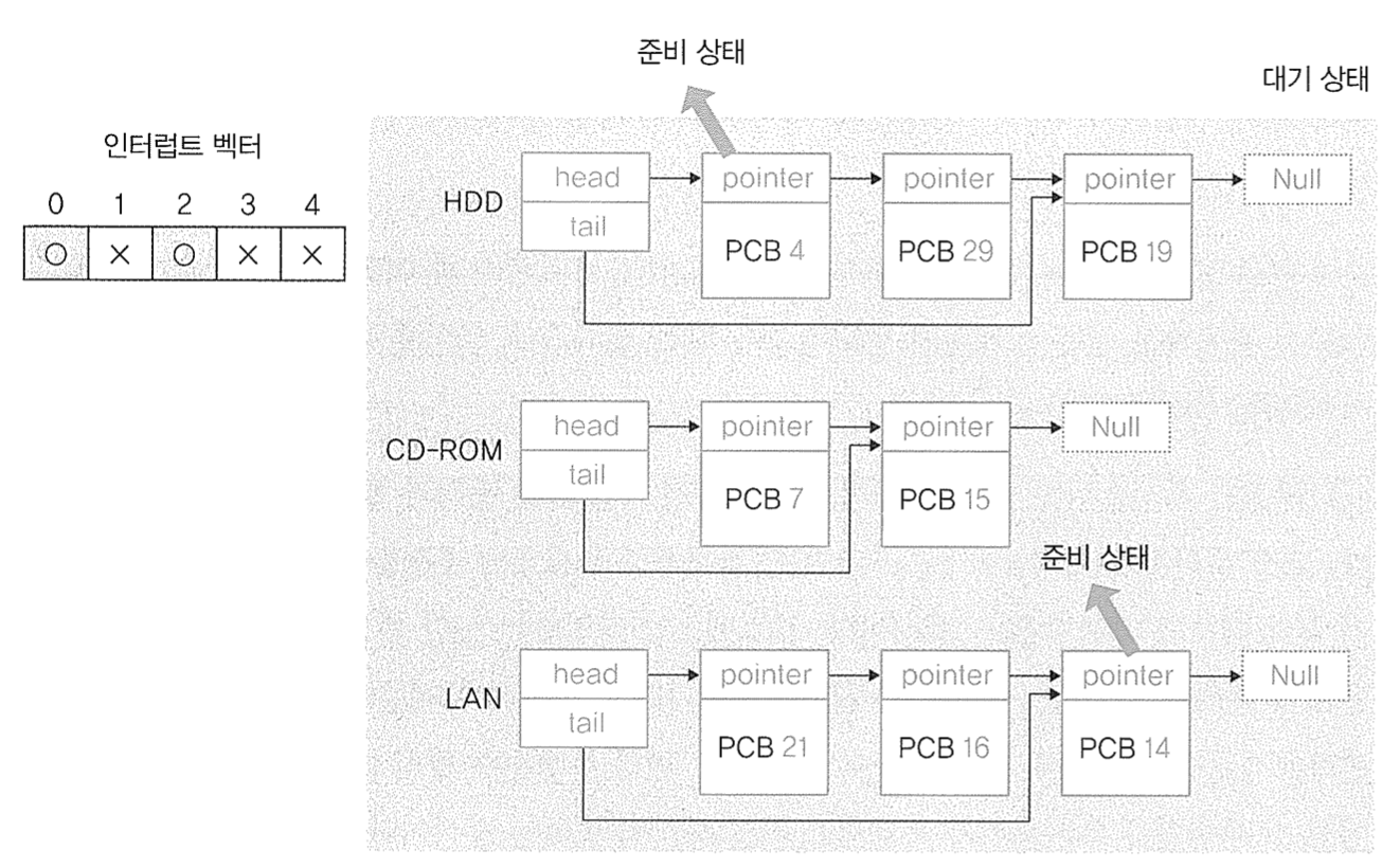 ์ ๊ทธ๋ฆผ์ ๊ฐ์ ์ ์ถ๋ ฅ์ ๊ธฐ๋ค๋ฆฌ๋ ํ๋ก์ธ์ค๋ผ๋ฆฌ ๋ชจ์ฌ ์๋ ๋๊ธฐ ํ๋ฅผ ๋ํ๋ธ๋ค. ์ค๋น ์ํ์ ๋ค์ค ํ์ ๋๊ธฐ ์ํ์ ๋ค์ค ํ๊ฐ์๋ ์ฐจ์ด๊ฐ ์๋ค. ์ค๋น ํ๋ ํ ๋ฒ์ ํ๋์ ํ๋ก์ธ์ค๋ฅผ ๊บผ๋ด์ด CPU๋ฅผ ํ ๋นํ๋ ๋ฐ๋ฉด, ๋๊ธฐ ํ๋ ์ฌ๋ฌ ๊ฐ์ PCB๋ฅผ ๋์์ ๊บผ๋ด์ด ์ค๋น ์ํ๋ก ์ฎ๊ธด๋ค. ์์คํ ์๋ ๋ง์ ์ ์ถ๋ ฅ์ฅ์น๊ฐ ์๊ธฐ ๋๋ฌธ์ ์ ์ถ๋ ฅ์ด ๋์์ ๋๋ ๊ฒฝ์ฐ ์ฌ๋ฌ ๊ฐ์ ์ธํฐ๋ฝํธ๊ฐ ํ๊บผ๋ฒ์ ์ฒ๋ฆฌ๋์ด์ผ ํ๋๋ฐ ์ด๋ฅผ ์ํด ์ธํฐ๋ฝํธ ๋ฒกํฐ๋ผ๋ ์๋ฃ๊ตฌ์กฐ๊ฐ ์ฌ์ฉ๋๋ค.