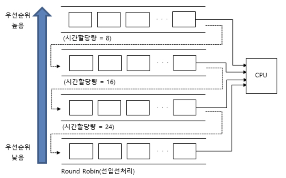 ์ฐ์ ์์๊ฐ ๋์ ์์ ํ ํ๋ก์ธ์ค์ ์์ ์ด ๋๋๊ธฐ ์ ์ ํ์ ํ ํ๋ก์ธ์ค์ ์์ ์ ํ ์๊ฐ ์๊ณ ํ์ ํ ํ๋ก์ธ์ค๊ฐ ์คํ๋๊ณ ์์ ๋ ์์ ํ ํ๋ก์ธ์ค๊ฐ ๋์ฐฉํ๋ฉด ๋๊ธฐ ์ํ๋ก ๋ณด๋ด๊ณ ์์ ํ ํ๋ก์ธ์ค๋ฅผ ์คํํ๋ค. ์ด๋, ์ฐ์ ์์๊ฐ ๋์ ํ๋ก์ธ์ค ๋๋ฌธ์ ์ฐ์ ์์๊ฐ ๋ฎ์ ํ๋ก์ธ์ค์ ์์ ์ด ์ฐ๊ธฐ๋๋๋ฐ, ์ด๋ฌํ ๋ฌธ์ ๋ฅผ ํด๊ฒฐํ๊ธฐ ์ํด ์ ์๋ ๊ฒ์ด ๋ค๋จ๊ณ ํผ๋๋ฐฑ ํ ์ค์ผ์ค๋ง์ด๋ค. ๋ค๋จ๊ณ ํ ์ค์ผ์ค๋ง์ ์์ด์ง ๊ธฐ๋ฒ์ด ์ ์ฉ๋ ์ค์ผ์ค๋ง ๊ธฐ๋ฒ์ด๋ผ๊ณ ์๊ฐํ๋ฉด ๋๋ค.