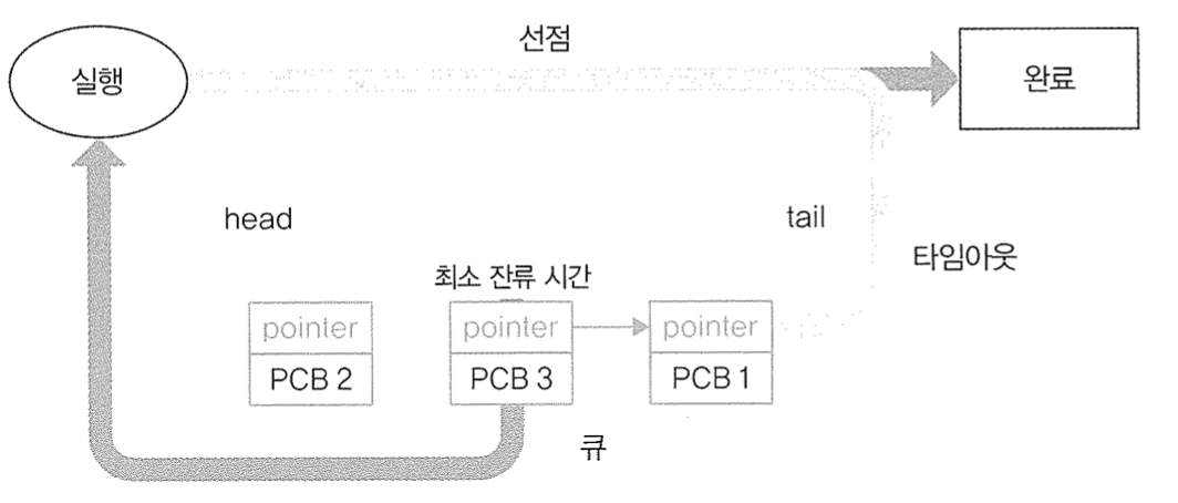 SJF ์ค์ผ์ค๋ง๊ณผ ๋ผ์ด๋ ๋ก๋น ์ค์ผ์ค๋ง์ ํผํฉํ ๋ฐฉ์์ผ๋ก ์ต์ ์๋ฅ ์๊ฐ ์ฐ์ ์ค์ผ์ค๋ง์ด๋ผ๊ณ ๋ ํ๋ค. ์ด ๋ฐฉ์์ SJF ์ค์ผ์ค๋ง์ ์ ์ ํ ๋ฒ์ ์ด๋ผ๊ณ ํ ์ ์๋ค. SRT ์ค์ผ์ค๋ง์ ๊ธฐ๋ณธ์ ์ผ๋ก ๋ผ์ด๋ ๋ก๋น ์ค์ผ์ค๋ง์ ์ฌ์ฉํ์ง๋ง, CPU๋ฅผ ํ ๋น๋ฐ์ ํ๋ก์ธ์ค๋ฅผ ์ ํํ ๋ ๋จ์ ์์ ์๊ฐ์ด ๊ฐ์ฅ ์ ์ ํ๋ก์ธ์ค๋ฅผ ์ ํํ๋ค. ์ด๋, ๋จผ์ CPU๋ฅผ ํ ๋น๋ฐ์ ์คํ๋๊ณ ์๋ ํ๋ก์ธ์ค๊ฐ ์๋๋ผ๋ ์ค๋น ํ์ ์์ ์๊ฐ์ด ๋ ์ ์ ํ๋ก์ธ์ค๊ฐ ์ค๋ฉด ํ์ฌ ์คํ๋๊ณ ์๋ ํ๋ก์ธ์ค๋ฅผ ๋๊ธฐ ์ํ๋ก ๋ณด๋ด๊ณ ์์ ์๊ฐ์ด ๋ ์ ์ ํ๋ก์ธ์ค๊ฐ CPU๋ฅผ ํ ๋น๋ฐ๊ฒ ํ๋ค.