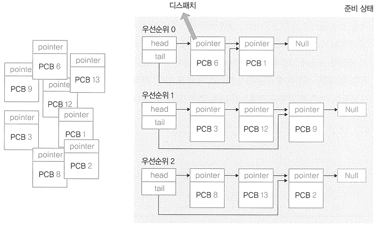 ์ฐ์ ์์์ ๋ฐ๋ผ ์ค๋น ํ๋ฅผ ์ฌ๋ฌ ๊ฐ ์ฌ์ฉํ๋ ๋ฐฉ์์ด๋ค. ํ๋ก์ธ์ค๋ ์ด์์ฒด์ ๋ก๋ถํฐ ๋ถ์ฌ๋ฐ์ ์ฐ์ ์์์ ๋ฐ๋ผ ํด๋น ์ฐ์ ์์์ ํ์ ์ฝ์ ๋๋ค. ๊ฐ ์ฐ์ ์์ ํ๋ ๋ผ์ด๋ ๋ก๋น ๋ฐฉ์์ผ๋ก ์ด์๋๋ฏ๋ก ํ๋ก์ธ์ค๊ฐ ํ์ ์ฝ์ ๋๋ ๊ฒ๋ง์ผ๋ก๋ ์ฐ์ ์์ ํ์์์ PCB ์ฐ์ ์์๊ฐ ๊ฒฐ์ ๋๋ค. ์ฐ์ ์์๋ ๊ณ ์ ์ฐ์ ์์๋ฅผ ์ฌ์ฉํ๋ฉฐ, ์๋จ ์ฐ์ ์์ ํ์ ์๋ ๋ชจ๋ ํ๋ก์ธ์ค์ ์์ ์ด ๋๋์ผ ๋ค์ ์ฐ์ ์์ ํ์ ์์ ์ด ์์๋๋ค.