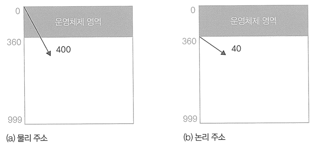 ์ค์ํ ๊ฒ์ ์ค์ ๋ก๋ ๋ฌผ๋ฆฌ ๋ฉ๋ชจ๋ฆฌ, ์ฆ ์ปดํจํฐ ๋ด์ ๋ฌผ๋ฆฌ์ ์ผ๋ก ์ค์น๋ ๋ฉ์ธ ๋ฉ๋ชจ๋ฆฌ์ 40๋ฒ์ง์ A๊ฐ ๋ค์ด๊ฐ๋ ๊ฒ์ด ์๋๋ผ๋ ์ ์ด๋ค. ์ ์ฝ๋๋ฅผ ์คํํ๋ ํ๋ก๊ทธ๋จ์ด ๋ฉ๋ชจ๋ฆฌ์ ์ฌ๋ผ์ค๋ฉด ์ด ํ๋ก๊ทธ๋จ์ ์ํ ๋ฉ๋ชจ๋ฆฌ ๊ณต๊ฐ์ ๋ฌผ๋ฆฌ ๋ฉ๋ชจ๋ฆฌ์ ์ด์์ฒด์ ์์ญ์ ์ ์ธํ ๋น ๊ณต๊ฐ์ ๋ฐฐ์น๋๋ค. ์ด๋, ์ด ํ๋ก๊ทธ๋จ์ ๋ฌผ๋ฆฌ ๋ฉ๋ชจ๋ฆฌ์ ์์ ์ฃผ์๋ 500๋ฒ์ง ์ผ ์๋ ์๊ณ 600๋ฒ์ง์ผ ์๋ ์๋ค. ์ด๋ ํ๋ก๊ทธ๋จ์ด ์คํ๋ ๋๋ง๋ค ์์ํ๋ ๋ฌผ๋ฆฌ ์ฃผ์๊ฐ ๋งค๋ฒ ๋ฐ๋๋ค๋ ๊ฒ์ ์๋ฏธํ๋ค.