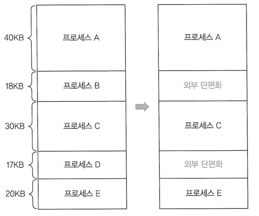 ์ด ํ์ํ๋ฏ๋ก ๋ฉ๋ชจ๋ฆฌ ๊ด๋ฆฌ๊ฐ ๋ณต์กํ๋ค๋ ๋จ์ ์ด ์กด์ฌํ๋ค. ์ด๋ ๊ฒ ๋ถ์ฐ์์ ์ธ ๋น ๊ณต๊ฐ์ ๋จํธํ(Fragmentation)๋ผ๊ณ ํ๋ค. ๊ฐ๋ณ ๋ถํ ๋ฐฉ์์์ ๋ฐ์ํ๋ ๋จํธํ๋ ํ๋ก์ธ์ค์ ๋ฐ๊นฅ์ชฝ์ ์์นํ๊ธฐ ๋๋ฌธ์ ์ธ๋ถ ๋จํธํ(External Fragmentation)๋ผ๊ณ ํ๋ค.