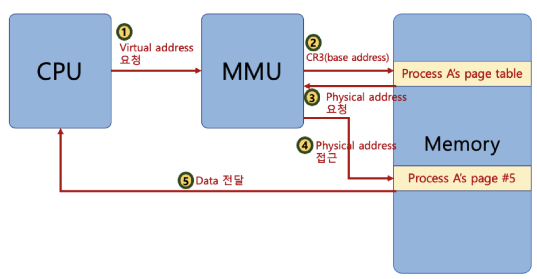 ์ CPU ์์ ์๋ MMU๊ฐ ๋ด๋นํ๋ค. ๊ฐ์ ์ฃผ์๋ฅผ ๋ฌผ๋ฆฌ ์ฃผ์๋ก ๋ณํํ๋ ค๋ฉด ์๋ ๊ทธ๋ฆผ์์ 2๋ฒ๊ณผ 4๋ฒ์ฒ๋ผ ๋ฉ๋ชจ๋ฆฌ์ ๋ ๋ฒ ์ ๊ทผํด์ผ ํ๋ค.