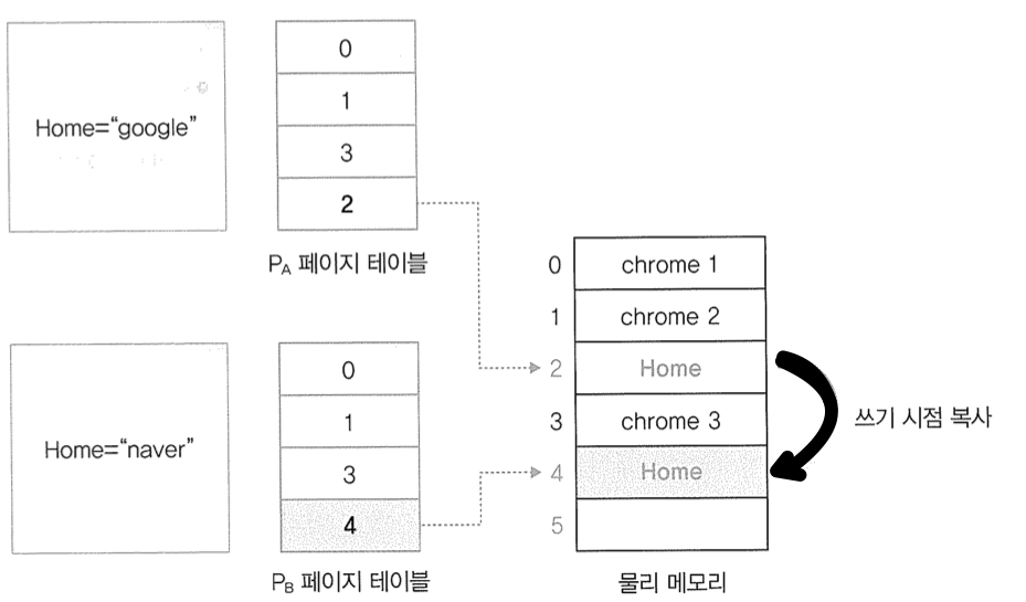 ๋ง์ฝ, ๊ธฐ์กด ํ๋ก์ธ์ค์์ ์ฌ์ฉํ๋ ๋ณ์๊ฐ์ ๋ณต์ฌ๋ ํ๋ก์ธ์ค์์ ๋ณ๊ฒฝํ๋ค๋ฉด ๊ธฐ์กด ํ๋ก์ธ์ค์ ์ํฅ์ ๋ผ์น๊ธฐ ๋๋ฌธ์ ์ด๋ฌํ ๊ฒฝ์ฐ์๋ ๊ฐ์ ํ๋ ์์ ๊ณต์ ํ ์ ์๋ค. ๊ทธ๋ ๋ค๊ณ ์ด ๋ณ์๋ฅผ ์ ์ฅํ๊ธฐ ์ํ ์ ํ๋ ์์ ๋ฏธ๋ฆฌ ํ๋ณดํ๋ ๊ฒฝ์ฐ๋ ๋ญ๋น์ผ ์ ์์ผ๋ ์ด์์ฒด์ ๋ ๋ฐ์ดํฐ ๋ณํ๊ฐ ์์ ๋๊น์ง ์๋ก์ด ํ๋ ์์ ํ๋ณด, ์ฆ ๋ณต์ฌ๋ฅผ ๋ฏธ๋ฃจ๋ ๋ฐฉ์์ ์ฐ๊ธฐ ์์ ๋ณต์ฌ๋ฅผ ์ฌ์ฉํ๋ค.