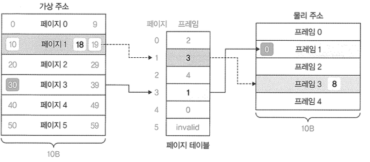 ์๋ฅผ ๋ค์ด, ์์ ๊ทธ๋ฆผ์ฒ๋ผ ๊ฐ์ ์ฃผ์ ๊ณต๊ฐ๊ณผ ๋ฌผ๋ฆฌ ์ฃผ์ ๊ณต๊ฐ์ 10B๋ก ๋๋์๋ค๊ณ ๊ฐ์ ํด ๋ณด์. ๋ง์ฝ, ํ๋ก์ธ์ค๊ฐ ๊ฐ์ ์ฃผ์ 18๋ฒ์ ์ด๋ค ๊ฐ์ ์ ์ฅํ๋ ค๋ฉด ๋ค์๊ณผ ๊ฐ์ ์ฃผ์ ๋ณํ ๊ณผ์ ์ ๊ฑฐ์น๋ค. ๋จผ์ , ๊ฐ์ ์ฃผ์ 18๋ฒ์ด ์ด๋ ํ์ด์ง์ ์๋์ง ํ์ด์ง ํ