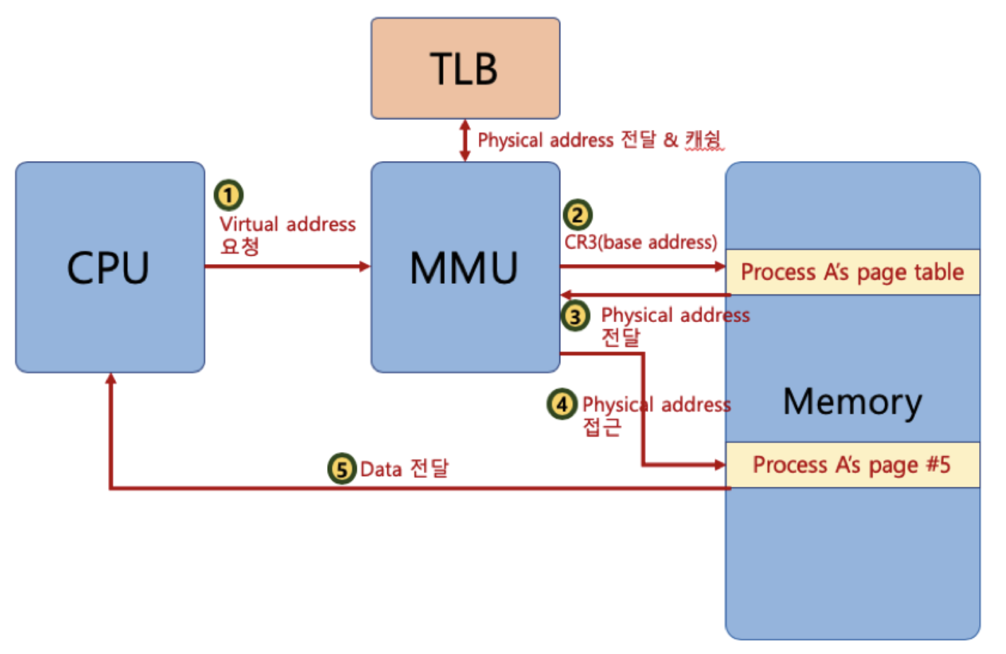 TLB ํํธ์ด๋ฉด 2๋ฒ๊ณผ 3๋ฒ ๋์์ ์๋ตํ๊ณ , TLB ๋ฏธ์ค์ด๋ฉด ์๋ต๋๋ ๋์ ์์ด ์งํํ๋ค.