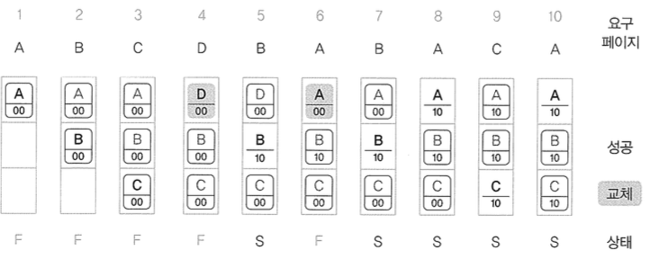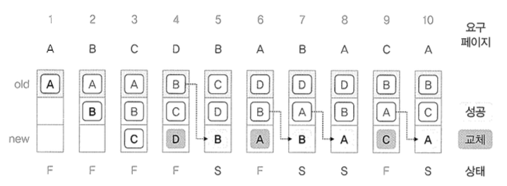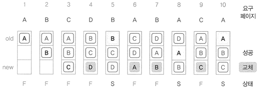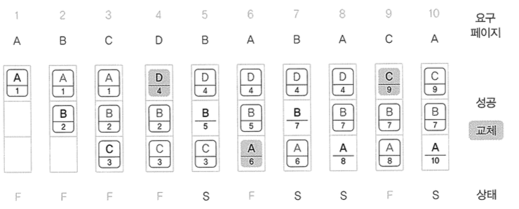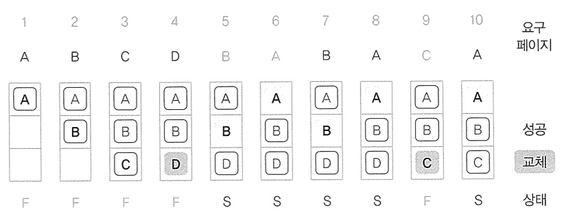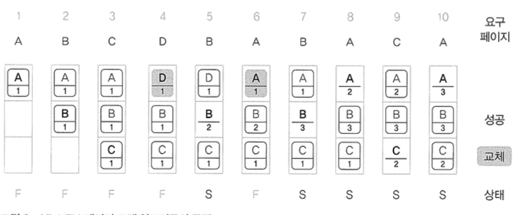 ์๊ฐ์์ผ๋ก ๋ฌผ๋ฆฌ ๋ฉ๋ชจ๋ฆฌ์ ๊ฐ์ฅ ๋จผ์ ๋ค์ด์จ ํ์ด์ง๋ฅผ ๋์ ํ์ด์ง๋ก ์ ์ ํ์ฌ ์ค์ ์์์ํจ๋ค. ํ์ด์ง ๋ถ์ฌ์ผ ๋๋ F, ์ํ๋ ํ์ด์ง๊ฐ ๋ฉ๋ชจ๋ฆฌ์ ์๋ ๊ฒฝ์ฐ๋ S๋ก ํ์๋์ด ์๋ค.