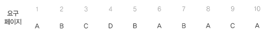 ๋ฉ๋ชจ๋ฆฌ๋ฅผ ์ถ๊ฐ์ ์ผ๋ก ์ฌ์ฉํด์ ๊ฐ ํ์ด์ง์ ์ ๊ทผํ ์๊ฐ์ ๊ธฐ๋กํ๋ค. 4๋ฒ ์์ ์์ ๊ฐ์ฅ ํ์ด์ง ์ ๊ทผ ์๊ฐ์ด ์ ์ ํ์ด์ง๋ A์ด๋ค. ๋ฐ๋ผ์, ํ์ด์ง A๋ฅผ ๋์ ํ์ด์ง๋ก ์ ์ ํ์ฌ ์ค์ ์์์ํค๊ณ ๊ทธ ์๋ฆฌ์ ํ์ด์ง D๋ฅผ ์ค์ ์ธ์ํจ๋ค.