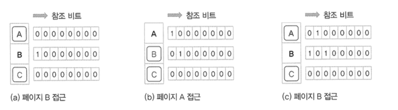 ๊ฐ ํ์ด์ง์ ์ผ์ ํฌ๊ธฐ์ ์ฐธ์กฐ ๋นํธ๋ฅผ ๋ง๋ค์ด ์ฌ์ฉํ๋ ๊ฒ์ด๋ค. ์ฐธ์กฐ ๋นํธ์ ์ด๊น๊ฐ์ 0์ด๋ฉฐ ํ์ด์ง์ ์ ๊ทผํ ๋๋ง๋ค 1๋ก ๋ฐ๋๋ค. ๋ํ, ์ฐธ์กฐ ๋นํธ๋ ์ฃผ๊ธฐ์ ์ผ๋ก ํ ์นธ์ฉ ์ค๋ฅธ์ชฝ ์ํํธ(>>) ๋๋ค.
