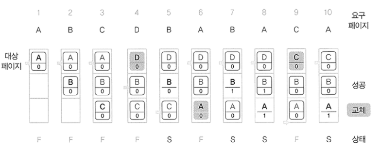 4๋ฒ ์์ ์ฒ๋ผ ๋ฉ๋ชจ๋ฆฌ๊ฐ ๊ฝ ์ฐผ์ ๊ฒฝ์ฐ ๋์ ํ์ด์ง๋ฅผ ๊ฐ๋ฆฌํค๋ ํฌ์ธํฐ๊ฐ ์ค์ ์ธ์ด ๋์์ ๊ฒฝ์ฐ ๋ฐ์ผ๋ก ์ด๋ํ๋ค. ์ด๋, 9๋ฒ ์์ ์ฒ๋ผ ์ฐธ์กฐ ๋นํธ๊ฐ 1์ธ ํ์ด์ง๋ 0์ผ๋ก ๋ฐ๊ฟ๋๊ณ ๊ฑด๋๋ด๋ค.