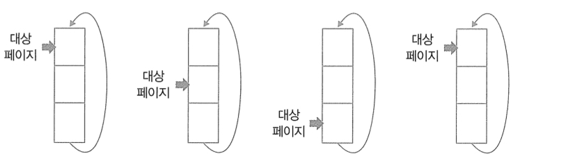 ์๊ณ ์๊ณ ๋ฆฌ์ฆ์์๋ ์ ๊ทธ๋ฆผ๊ณผ ๊ฐ์ด ๋์ ํ์ด์ง๋ฅผ ๊ฐ๋ฆฌํค๋ ํฌ์ธํฐ๋ฅผ ์ฌ์ฉํ๋๋ฐ, ์ด ํฌ์ธํฐ๊ฐ ํ์ ๋งจ ์๋๋ก ๋ด๋ ค๊ฐ๋ฉด ์๊ณ์ฒ๋ผ ๋ค์๋ฒ์๋ ๋ค์ ํ์ ์ฒ์์ ๊ฐ๋ฆฌํค๊ฒ ๋๋ค.