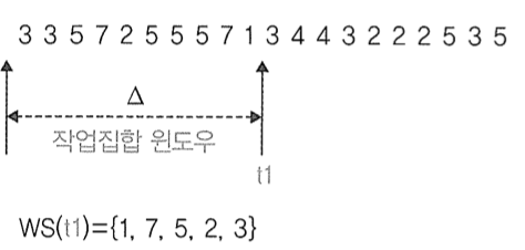 ํ์ฌ ์์ t1์์์ ์ฐธ์กฐ๋ ํ์ด์ง๋ก๋ถํฐ 10๋งํผ ๋จ์ด์ง ๊ณผ๊ฑฐ ์์ ์ ์ฐธ์กฐ๋ ํ์ด์ง๊น์ง๋ฅผ ์์ ์งํฉ์ ๋ค์ด๊ฐ ํ์ด์ง ์ ํ์ ์ํ ํ์ ๋ฒ์, ์ฆ ์์ ์งํฉ ์๋์ฐ๋ Δ์ด๊ณ , ์์ ์งํฉ ์๋์ฐ์ ํฌ๊ธฐ(Working Set Window Size)๋ 10์ด๋ค. ๋ํ, ์์ ์งํฉ ์๋์ฐ๋ก๋ถํฐ ์์ ์งํฉ WS(t1)์ { 1, 7, 5, 2, 3 } ๋ผ๋ ๊ฒ์ ์ ์ ์๋ค. ๋ง์ง๋ง์ผ๋ก, ์์ ์งํฉ ํฌ๊ธฐ๋ 5์ด๋ค. ์ด๋, ์์ ์งํฉ ํฌ๊ธฐ๋ ์์ ์งํฉ ๊ฐฑ์ ์ฃผ๊ธฐ๋ผ๊ณ ๋ ํ๋ค. ์๋ ๊ทธ๋ฆผ์ ๋ณด์.