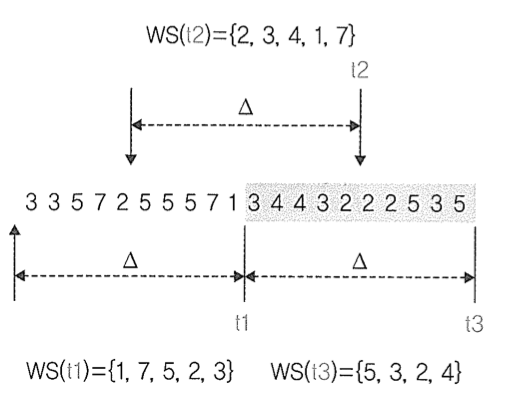 ์์ ์งํฉ ํฌ๊ธฐ๊ฐ 5์ด๋ฏ๋ก ํ์ฌ ์์ t1์์ 5๋งํผ ๋จ์ด์ง ๋ฏธ๋ ์์ t2์๋ ๋ค์ ์์ ์งํฉ ์๋์ฐ๋ฅผ ์ค์ ํด ์๋ก์ด ์์ ์งํฉ์ ์์ฑํ๋ค. ์ด๋, ์ฃผ์ํด์ผ ํ ์ ์ด ์๋ค. t2์์ ์์์ ์์ ์งํฉ ์๋์ฐ๋ฅผ ๋ณด๊ฒ ๋๋ฉด ํ์ด์ง 5๊ฐ ์กด์ฌํ๋ ๊ฑธ ๋ณผ ์ ์๋ค. ํ์ง๋ง, WS(t2)์๋ ํ์ด์ง 5๊ฐ ๋ค์ด๊ฐ์ง ๋ชปํ๋ค. ์๋ํ๋ฉด, ์์ ์งํฉ ์๋์ฐ์์ t2, ์ฆ ํ์ฌ ์์ ๊ณผ ๊ฐ๊น์ด ๊ณผ๊ฑฐ ์์ ์ ์ฐธ์กฐ ํ์ด์ง๋ค๋ถํฐ ์ ํํ๊ธฐ ๋๋ฌธ์ด๋ค.