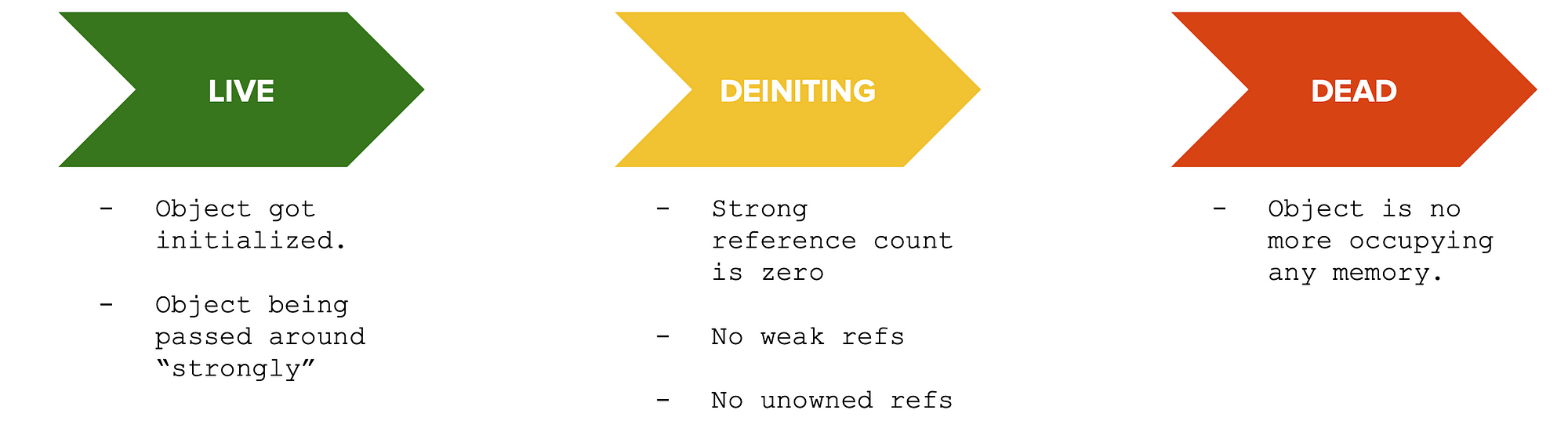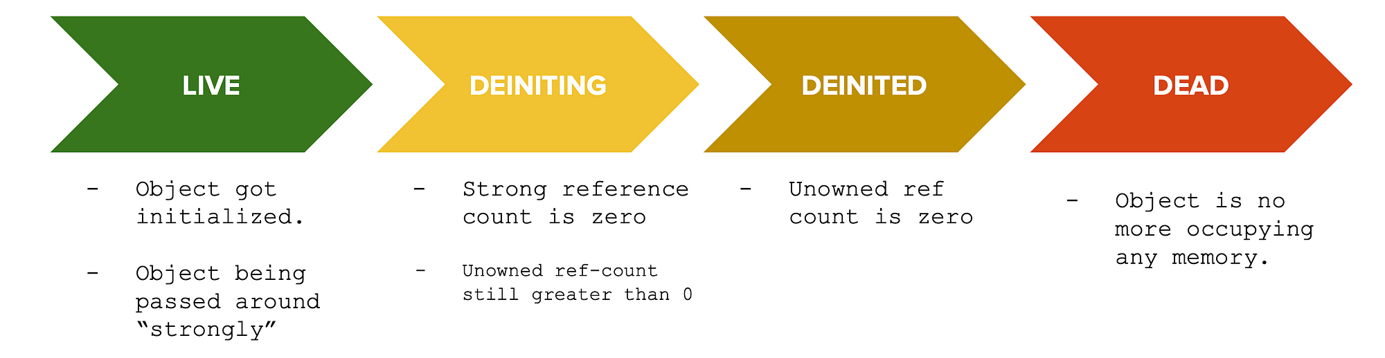 Swift์ ์ฐธ์กฐ ํ์ ์ธ์คํด์ค๋ 3๊ฐ์ง ์ฐธ์กฐ ๋ฐฉ์์ ๋ํ ์ฐธ์กฐ ์นด์ดํธ์ ๋ฐ๋ผ ๊ฐ๊ฐ์ ๋ค๋ฅธ ์๋ช ์ฃผ๊ธฐ๋ฅผ ๊ฐ์ง๋๋ค.