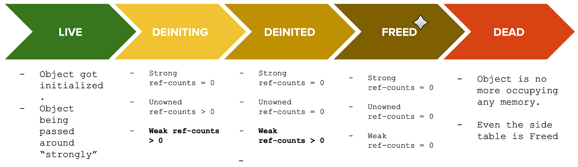 ์ด๋ฌํ ๋ฐฉ์์ strong RC ๊ฐ์ด 0์ด ๋์ด๋ weak RC ๊ฐ์ด 0 ์ด์์ด๋ผ๋ฉด deinitialized๋ ๋์ง๋ง deallocated๋ ๋์ง ๋ชปํฉ๋๋ค. ๋ฐ๋ผ์, ์ข๋น ์ค๋ธ์ ํธ๋ฅผ ๋ฐ์์ํค๋ ๋ฌธ์ ์ ์ด ๋ฐ์ํ์์ต๋๋ค.