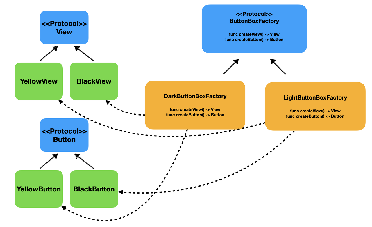 추상 팩토리 메서드 패턴은 팩토리 메서드 패턴 사용 중 서로 관련 있는 객체의 집합을 생성하고자 할 때 사용되는 디자인 패턴이다. 아래 그림과 같이 View와 Button의 Creator들을 한번 더 추상화함으로써 조합이 보장될 수 있게 해 준다. (그림에서 DarkButtonBoxFactory를 BlackViewYellowButtonFactory, LightButtonBoxFactory를 YellowViewBlackButtonFactory로 생각하면 이해하기 쉽다.)