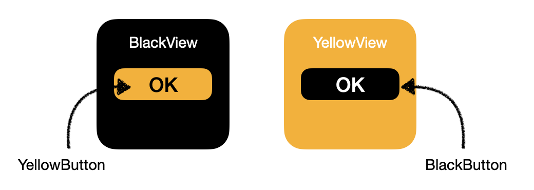 BlackView, BlackButton, YellowView, YellowButton 객체들을 조합하여 위 그림과 같은 조합의 객체를 생성해야 하는 상황이라고 가정해 보자.