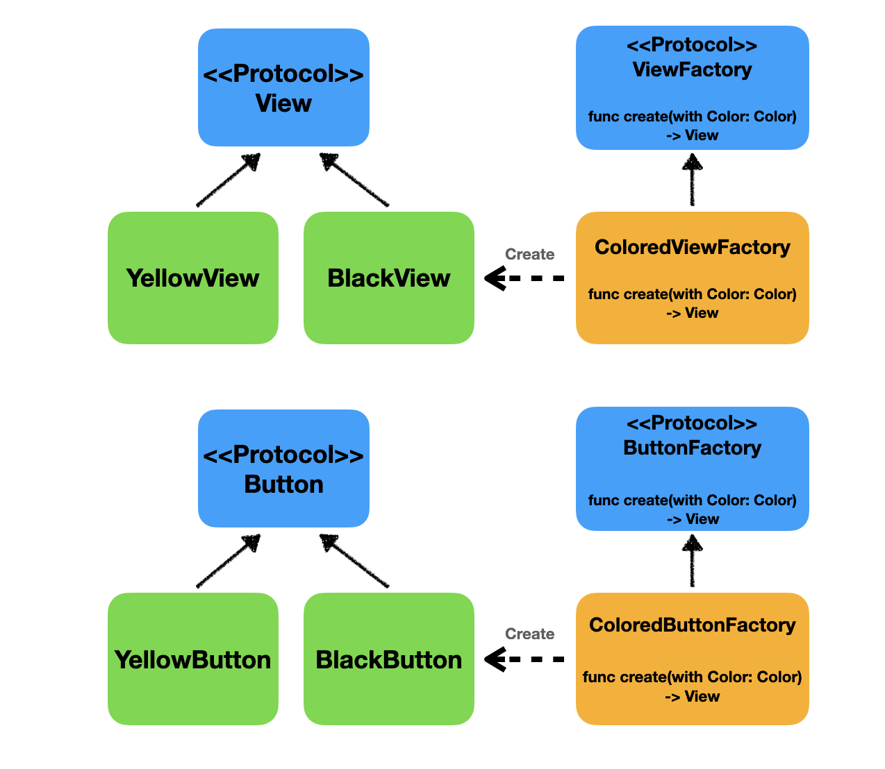 각 객체들을 팩토리 메서드 패턴을 사용해서 생성하고자 한다면 아래 그림과 같이 BlackView와 YellowView는 View의 Concrete Product로 하고 ColoredViewFactory라는 Concrete Creator를 생성할 것이고, BlackButton과 YellowButton은 Button의 Concrete Product, ColoredButtonFactory를 Concrete Creator로 생성할 것이다.